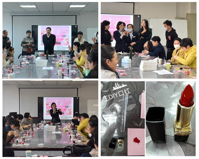另一邊的37棟305教室,指導老師正在給女教工們介紹口紅制作步驟和注意事項。大家精心調配顏色、將原材料按照比例攪拌均勻、加熱上色、倒入模具中冷卻成型,最終脫模裝進口紅管里。當一包包原材料變成一支支精美的口紅,每位女職工臉上都洋溢著幸福和喜悅。
