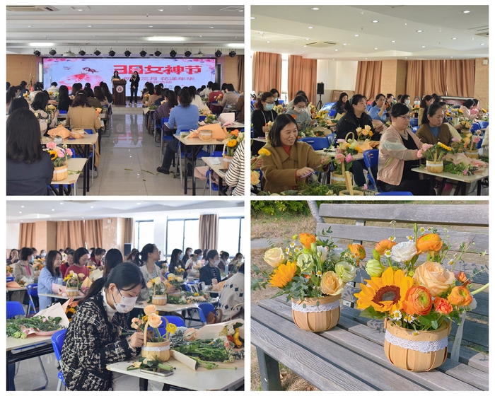 在大學生活動中心,插花活動正在如火如荼地開展,挑選花卉、搭配顏色、修剪花枝、精心插放……在花藝師的悉心指導下,朵朵嬌艷的鮮花在女教職工們的巧手下搖身一變成了飽含意境的藝術品。插花作品完成后,大家紛紛手捧鮮花拍照留念。