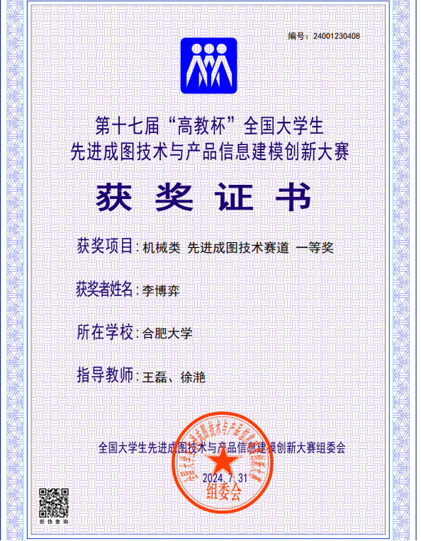 支部還充分利用第二課堂,以“高教杯”全國大學生先進成圖技術與產品信息建模創新大賽為突破口,培養學生的創新意識和開拓精神,提高學生的綜合素質與能力。僅2023年,支部黨員李博弈、劉凡、楊明宇帶領學生獲省級榮譽11項和國家級榮譽8項。李博弈獲得全國一等獎的優異成績,創造了我校在該項賽事中的最好成績,為學院和合肥大學爭得了榮譽。