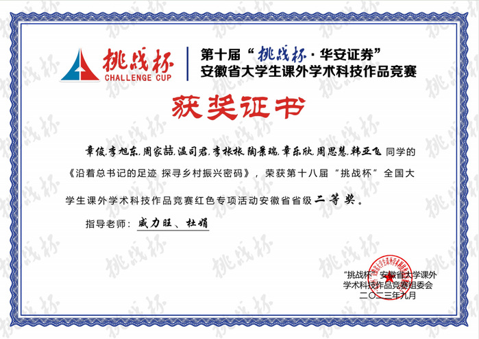 支部成立“尋跡知過去 奮斗向未來”暑期社會實踐團隊,在河北、福建、安徽重走習近平總書記的工作歷程和考察足跡,再訪總書記曾接見的大灣村村民陳澤申、大包干帶頭人嚴金昌和寫信代表劉明華等人,開展了一系列以黨史學習、紅色教育、創新創業、疫情防控為主題的社會實踐活動,調研總里程數達4500公里。支部成員在學習實踐中追尋領袖足跡,感悟領袖思想偉力,最終獲得安徽省暑期三下鄉優秀實踐團隊和第18屆挑戰杯紅色專項活動安徽省省級二等獎。