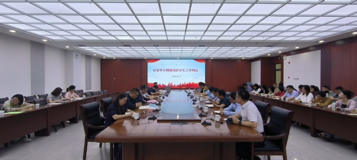 5月27日,學校在大學生活動中心一樓會議室召開2025年春季學期第四次學生工作例會。黨委委員、副校長白義香出席會議并講話,相關職能部門負責人、各二級學院黨委書記、副書記、學工辦負責人,各物業公司負責人參會,會議由學生處處長丁增云主持。