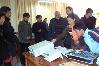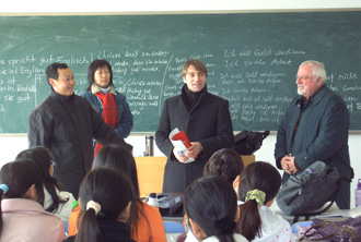 德國客人一行還參觀了我院教學主樓及機房、實驗室等教學資源。Heinz-Guenter Luck先生參觀后說,貴院的規模很大,教學設備也相當齊全。他們還饒有興趣地來到外國語言文學系2003級英語本科的課堂上,與正在學習德語的學生和教師進行互動交流。