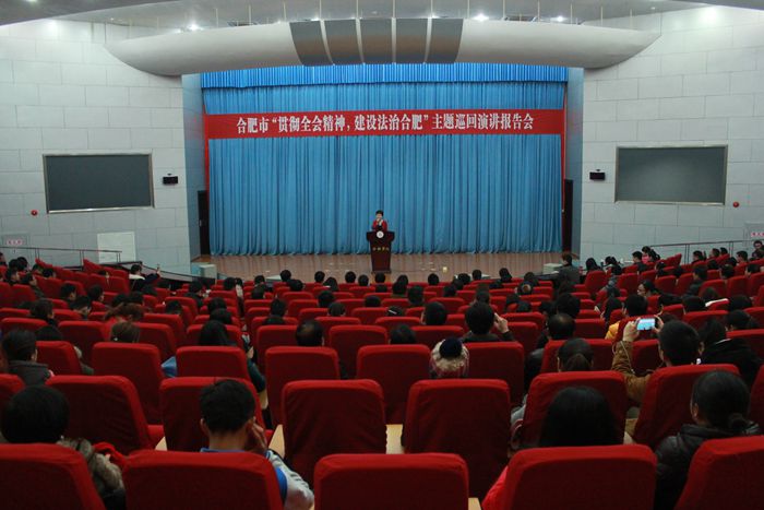 為深入學習貫徹黨的十八屆四中全會精神,大力弘揚社會主義法治理念和法治精神。1月13日,合肥市“貫徹全會精神,建設法治合肥”主題巡回演講報告會于我校二區圖書館學術報告廳A廳舉行,八名進入合肥市決賽的選手為大家帶來了精彩演講。市委宣傳部宣教處副處長魏琪、合肥市經開區工委辦副主任俞光遠、我校黨委宣傳部部長白義香和團委副書記朱濤、包河區各街道宣傳委員、社區普法員和宣傳委員以及我校師生共300多人出席報告會。
