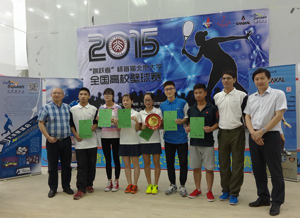 我校壁球校隊成立于2014年10月,由公體部胡世琪老師擔任教練。每周的三次高強度訓練使隊員們的技戰術水平得到較大提高。雖然是首次出征,比賽中隊員們擺正心態,沉著應戰,最終取得了不俗戰績。本屆比賽也吸引了外國留學生的參與。其中,來自北京大學、浙江大學等新加坡、馬來西亞、巴基斯坦留學生壁球高手以其高超的技藝博得賽場觀眾的陣陣掌聲。留學生的加盟使得本屆比賽增添了“國際范兒”。通過現場觀摩和與高手正面交鋒,我校隊員普遍感到獲益良多。