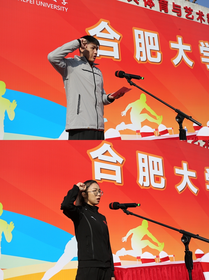 經濟與管理學院2022級國際經濟與貿易專業學生、第27屆全國大學生擊劍競標賽個人和團體冠軍獲得者王凱霆和公共體育與藝術教學部歐陽井鳳老師代表全體運動員與裁判員宣誓。