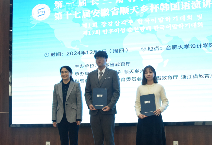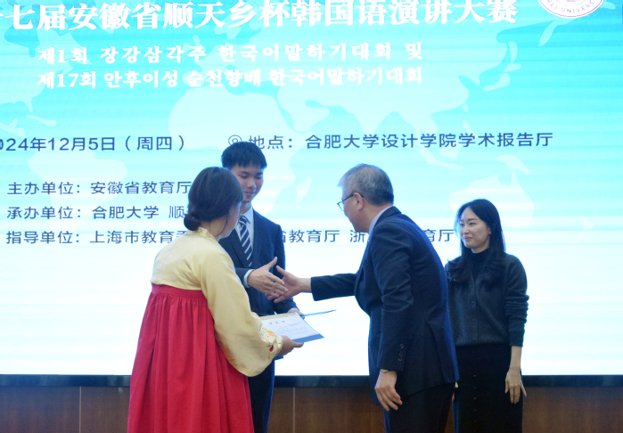 12月5日,第一屆長三角韓國語演講大賽暨第十七屆安徽省“順天鄉杯”韓國語演講大賽決賽在我校55棟學術報告廳舉辦。黨委副書記、校長任永,順天鄉大學副校長金龍夏和省教育廳外事處處長姚德勇出席開幕式,副校長陳秀出席頒獎典禮。