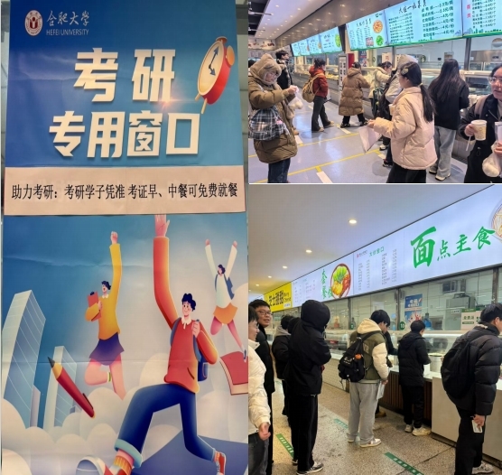 學(xué)校全力為考生提供暖心后勤保障服務(wù),食堂開設(shè)考研專用窗口,考試期間免費(fèi)供應(yīng)一日三餐及暖心姜湯,提供營養(yǎng)均衡、種類豐富的菜品,贈(zèng)送“考研助力包”,為考研學(xué)子加油鼓勁。