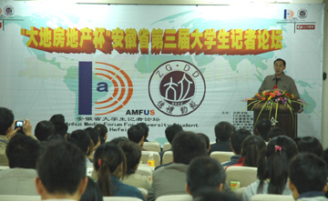 在論壇開幕式上。合肥學院副院長陳嘯首先致歡迎詞,陳嘯副院長對論壇的前期工作給予了充分肯定,對論壇的開幕表示祝賀,對省教育廳等單位長期對論壇的支持表示感謝,同時希望大家一起努力,再接再厲,力爭把論壇打造成全省大學生記者交流提高的有效平臺和促進學生關注現實,全面成材的有效渠道!安徽省教育廳社政處副處長楊建華在開幕式上指出,大學生記者論壇,形式新穎,主題突出,影響很好,目前以成為省內大學生交流、提高的品牌活動,希望主辦方共同努力,把這一平臺繼續延伸、擴大,認真選好論壇主題,聯系現實,聯系大學生成材實際,切實推動大學生全面成材。安徽省高校校報研究會副理事長、安徽醫科大學黨委宣傳部副部長朱梅福,合肥市文化館副館長劉浩及大地房地產有限公司總經理陸翠華,《安徽青年報》、《合肥晚報》的代表也發表了激情洋溢的講話。大家一致認為,此次論壇的主題較前兩屆而言,更具時代性,現實意義更強,對老師、學生更有啟發意義。論壇的連續舉辦,在合肥地區乃至整個安徽省都產生了重要影響。希愿校園記者們要一如既往地保持探索和鉆研精神,為推動校園文化建設貢獻自己的力量。