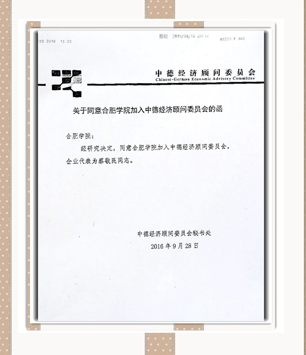 Am 28.09.2016 erteilte der chinesisch-deutsche beratende Wirtschaftsausschuss des chinesischen Handelsministeriums in einem offiziellen Schreiben an die Universit?t Hefei die offizielle Genehmigung zu ihrer Beteiligung am chinesisch-deutschen beratenden Wirtschaftsausschuss. Als Vertreter wurde der Parteisekret?r der Universit?t Hefei, Prof. Cai Jingmin, ernannt. Die Universit?t Hefei gilt als der erste Hochschulvertreter des Wirtschaftsausschusses und wird im Oktober an der Rundtisch-Konferenz zur industriellen Zusammenarbeit zwischen Deutschland und China (Provinz Anhui) in Peking teilnehmen.