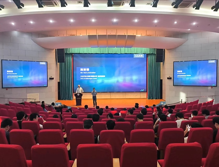 施耐德教授圍繞大眾汽車,對汽車制造工藝、汽車生產(chǎn)中的智能化趨勢應用案例以及智能制造方案如何落地等內(nèi)容進行了詳細講解。在互動交流環(huán)節(jié),同學們積極提問,施耐德教授耐心解答,并對大眾學院的學生提出了殷切期望。