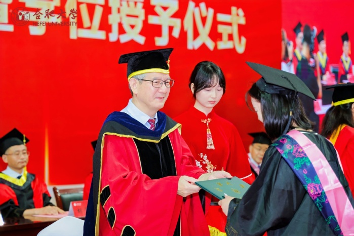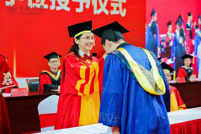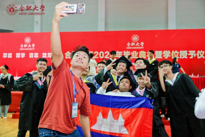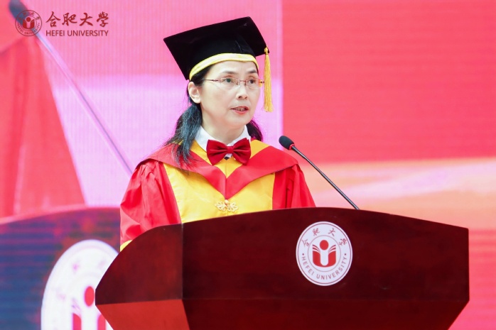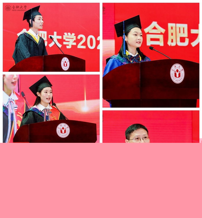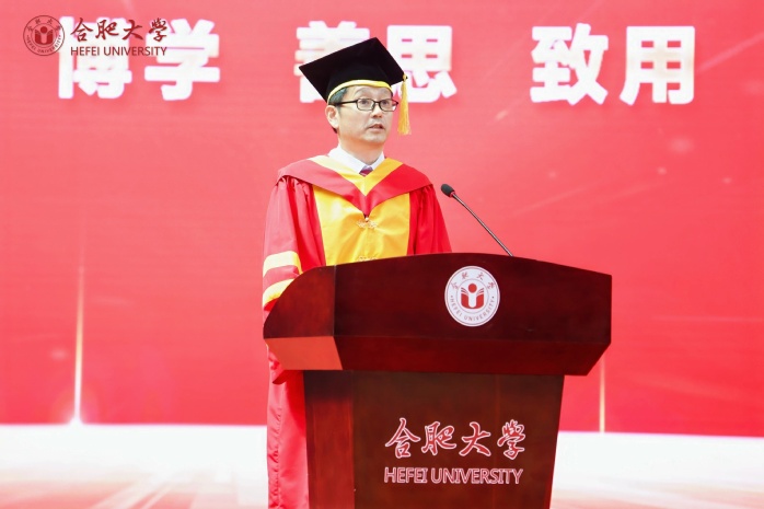 本科生畢業生代表徐桐、研究生畢業生代表詹學娟、留學生畢業生代表蘇陽、“西部計劃”畢業生志愿者代表徐思揚、教師代表孫強教授相繼發言。徐桐表示將不負學校栽培,向下扎根,投身基層,建功西部,在鄉村沃土綻放青春,服務地方,用行動與奮斗為母校增光添彩。詹學娟向母校和老師致以誠摯的感謝,并回憶了自己在校期間的科研和求學經歷,表示未來將努力提升自我,助力經濟社會的發展。蘇陽回顧了中柬長期以來友好往來、深度合作的偉大歷程,對“一帶一路”建設和合肥大學的培養表示感謝。徐思揚講述了個人“三下鄉”實踐經歷,號召廣大學子要用自己的知識和力量去服務人民,推動西部地區的發展。孫強表示,青年學子要堅守初心,不忘使命,始終保持對學習的熱情,做到學而不輟,勇敢面對未來的挑戰和機遇,保持積極昂揚的精神狀態,最終通向理想的彼岸。