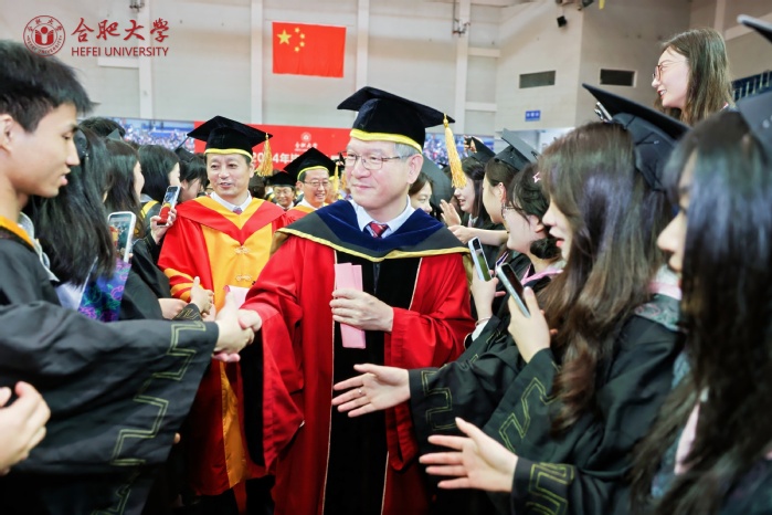 典禮最后,校領導、校學位評定委員會成員與在場畢業生握手送別、合影留念。