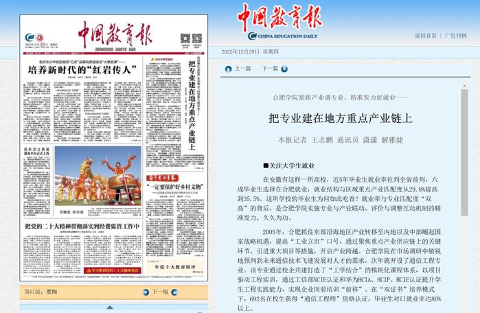 《中國(guó)教育報(bào)》頭版聚焦合肥學(xué)院“三業(yè)一體”式發(fā)展