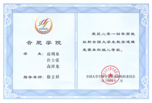 合肥學院大學生數學建模競賽,在徐立祥、李旭、江立輝、李寧等老師的指導下,在各屆參賽全體大學生的共同努力下,成績斐然,多次獲得國家級和國際級獎。人工智能與大數據學院徐立祥老師擔任我校大學生數學建模競賽負責人。