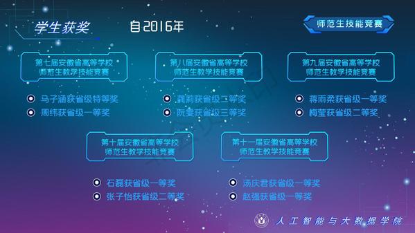 人工智能與大數據學院緊緊圍繞學校人才培養中心工作,2012年以來積極開展以學生科技創新創業為主的第二課堂工作,以學生“能力水平、專業類別和興趣愛好”為根本出發點,目前成立了: RoboCup機器人足球、數學建模、AR/VR團隊、物聯網創新設計、移動應用開發、ACM-ICPC算法設計、仿人機器人、水下機器人、區塊鏈、網絡與信息安全等16支團隊,并且專門建設了機器視覺應用、數學建模與仿真等6個學生創新實驗室、移動APP開發、多智能體系統、數據分析與仿真等8個大學生創客中心;為各團隊提供良好的環境和資源。通過這些工作的開展,人工智能與大數據學院大學生的創新創業能力逐步增強,目前有200余人常駐創新創業實驗室。近五年在師生共同努力下,在各類競賽中共獲獎800項,其中國際級21項,國家級獎項160余項、省級獎項600余項。RoboCup機器人2D仿真足球隊連續5次進入世界杯前8強,先后獲得葡萄牙公開賽冠軍、世界杯季軍等國際獎項,是世界杯、中國機器人足球賽公認強隊;此外獲得中國機器人大賽暨RoboCup公開賽曾獲得國家特等獎1項、美國大學生數學建模競賽獲得國際二等獎6項,全國大學生數學建模競賽獲得國家二等獎1項,CCPC中國大學生程序設計競賽總決賽銀牌,Robocup機器人世界杯中國賽獲得亞軍,“哈工大杯”第十六屆全國機器人錦標賽暨“博思威龍杯”第五屆國際仿人機器人奧林匹克大賽獲得國家一等獎2項,“藍橋杯”全國軟件和信息技術專業人才大賽個人賽曾獲得國家一等獎2項,“田家炳杯”第六屆全國師范院校師范生教學技能競賽國家二等獎、第二屆全國師范生微課設計大賽國家特等獎等。獲批大學生創新創業訓練計劃項目國家級86項,省級168項,獲批大學生創客實驗室項目8項,2名優秀學生獲得安徽省“創新之星”榮譽稱號。
