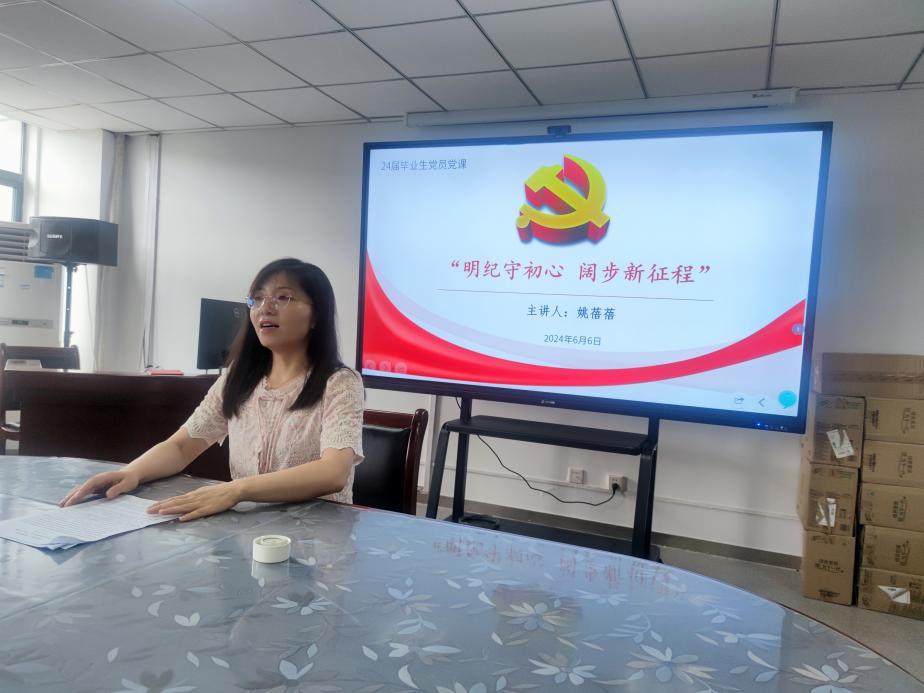 緊接著,學院黨委副書記姚蓓蓓為畢業生黨員帶來了題為“明紀守初心 闊步新征程”感人至深的最后一節黨課。她結合近年來國家、學校經歷的意義非凡的時刻,深情回顧了畢業生黨員們在大學期間的成長與收獲,勉勵他們青春不能任性,紀律不容挑戰,努力成為心中有夢、眼中有光、手中有活、腳下有力、肩上有責的時代新人鼓勵他們立足當下,站好最后一班崗,在完成學業、實現就業、文明離校三個方面,發揮模范帶頭作用同時,姚蓓蓓也向畢業生黨員們提出了殷切的期望,希望他們能夠在未來的工作和生活中,始終保持黨員本色,積極傳播正能量,關注母校發展,以實際行動維護母校形象。