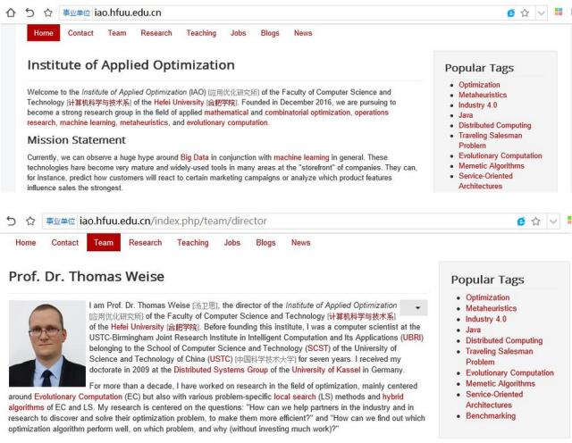 湯衛思(Tomas Weise)教授,于德國完成博士學業后,先后七年在中國高校完成博士后及副教授崗位工作,在計算機數據處理及方案優化領域,研究能力強勁,先后在國際知名權威學術雜志發表多篇具有影響力的文章,并參與和執行有多項中國國家自然科學基金等項目。湯衛思教授目前被引進我校,于我校計算機科學與技術系牽頭成立應用優化研究所(IAO,迅速開展啟動多項研究工作。此外,他還利用個人學術領域影響力,廣泛宣傳我校中德教育合作示范基地,為我校引進更多國際化高層次人才。