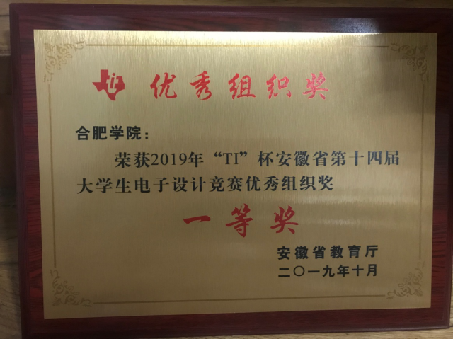 合肥學院榮獲2019年“TI”杯安徽省第十四屆大學生電子設計競賽優秀組織獎一等獎,參賽學生榮獲安徽省一等獎4項,二等獎1項,三等獎5項。(先進制造工程學院李翠花