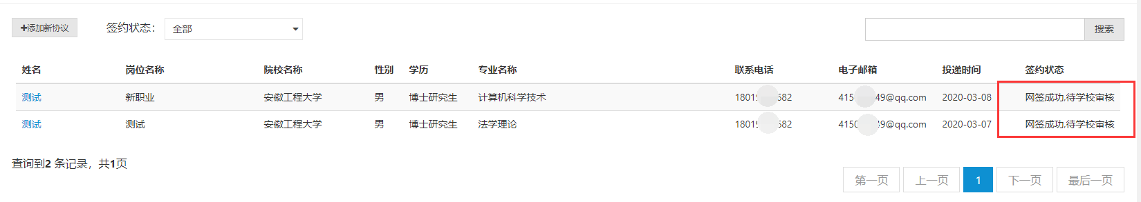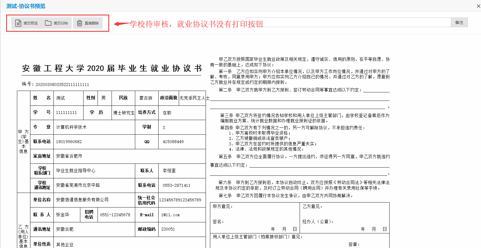 簽約成功后,簽約狀態為“簽約成功,待學校審核”,就業協議書不能打印。