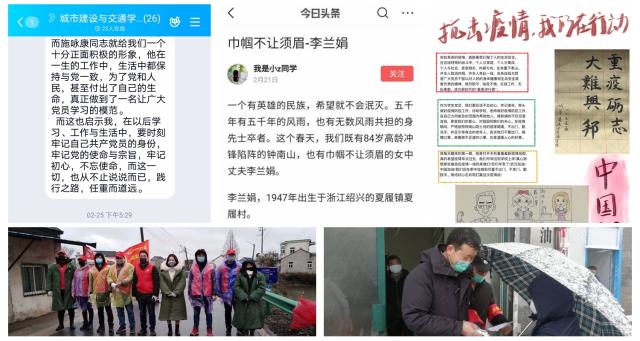 學院黨委在戰(zhàn)“疫”之初便迅速成立疫情防控工作領導小組,在前期值守等工作基礎上,要求教工支部、學生支部立即行動起來,以“抗疫”黨員在行動為主題開展線上主題黨日活動,并帶動廣大團員青年。全體學生黨支部書記、輔導員、班主任通過工作群、視頻會議、點對點電話聯(lián)系等方式,時時傳遞弘揚戰(zhàn)“疫”正能量,開展向“最美逆行者”學習、向施詠康同志學習、向?qū)W校抗疫一線先進人物學習等活動。通過網(wǎng)上主題團日、主題黨日等形式,開展疫情防控思想引導,讓學生在疫情防控這堂鮮活生動的思政大課堂感知國家的偉大力量、我國社會主義制度的優(yōu)越性,涵養(yǎng)愛黨愛國愛社會主義的忠誠情懷和社會擔當。學生第三黨支部詹學娟同學通過在自媒體平臺“今日頭條”撰寫文章,使更多的讀者了解英雄事跡,鼓勵大家萬眾一心,共同抗疫。其撰寫的“巾幗不讓須眉-李蘭娟”一文,累計閱讀量過萬,收獲54條評論和207個贊。李清清、孔微等五名學生黨員以創(chuàng)作漫畫的形式,致敬逆流而上的抗疫英雄,鼓舞抗疫信心,宣傳防疫小知識。
