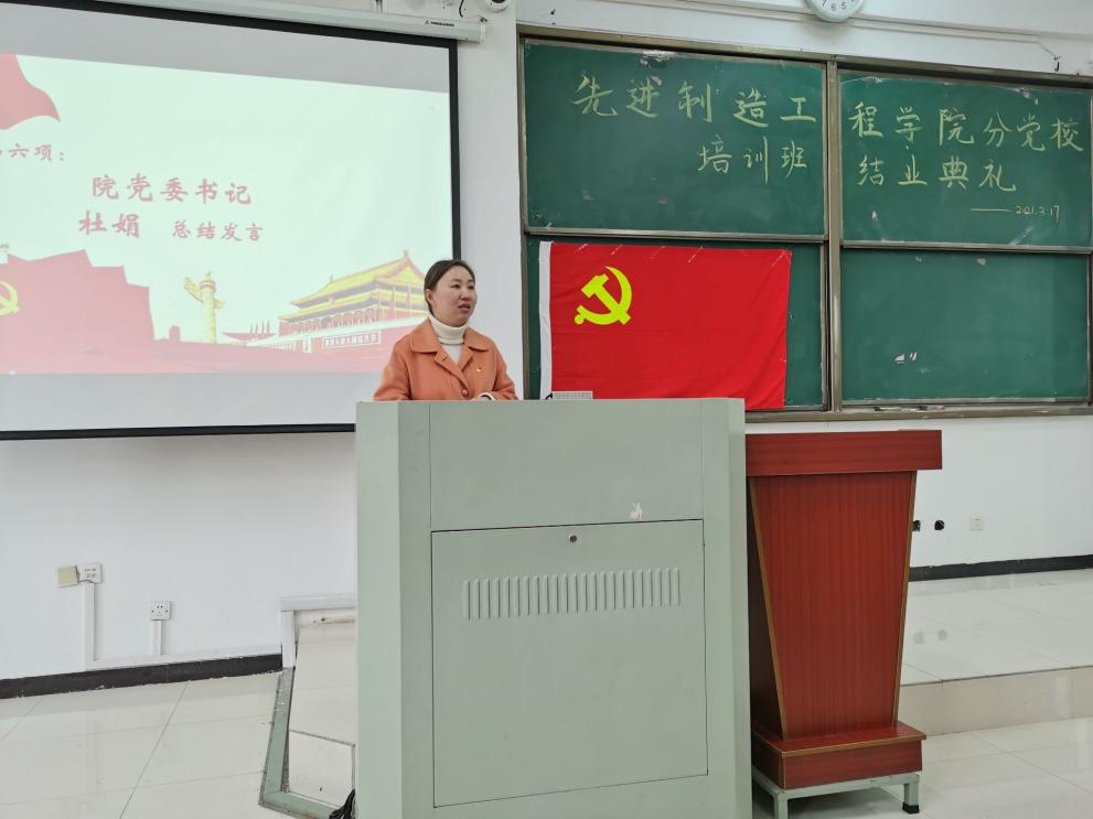 2021年3月17日中午12:30,先進制造工程學院分黨校第二期入黨積極分子暨發展對象集中培訓班結業典禮于38棟3JT教室順利進行。院黨委書記杜娟、黨委副書記李秀娟、各黨支部書記出席了典禮,100余名黨校畢業學員參加了典禮,典禮由研究生支部書記威力旺老師主持。