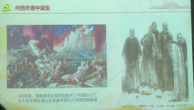 180年侵略者用堅船利炮轟開了中國的大門,五千年文明古國從此慘遭帝國主義列強鐵蹄蹂躪。1921年7月23日,中國共產黨第一次全國代表大會在上海開幕,最后一天的會議轉移到浙江嘉興南湖舉行,大會通過中國共產黨的第一個綱領和決議,選舉產生中央局,陳獨秀為中央局書記,標志著中國共產黨于內憂外患中誕生。
