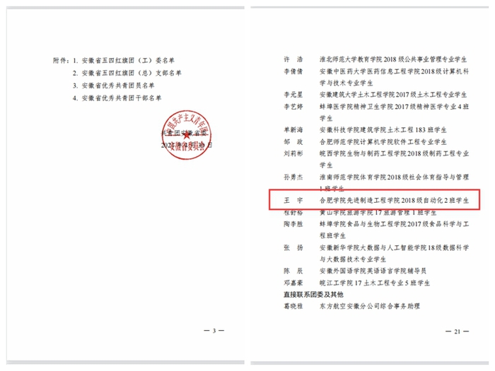 近日,共青團安徽省委員會公布2020年度安徽省“兩紅兩優”評選表彰結果,我校先進制造工程學院2018級自動化專業王宇同學榮獲“安徽省優秀共青團員”稱號。
