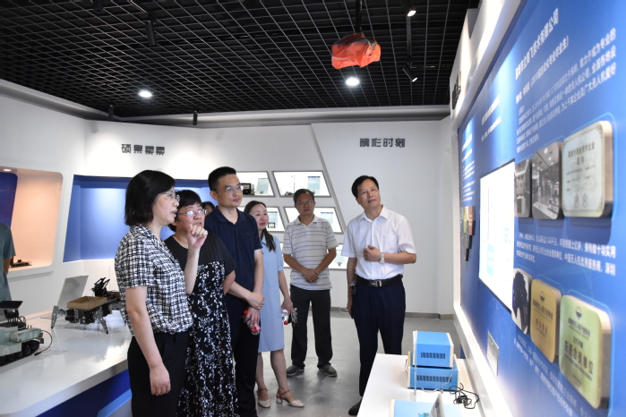 在成果展覽室,李秀娟、高先和向吳春梅詳細介紹了學院近年來“互聯網+”、“挑戰杯”、全國大學生智能車競賽、全國大學生電子設計大賽、“西門子杯”中國智能制造挑戰賽、全國大學生機械創新設計競賽等A類賽事取得的豐碩成果,以及學生科技成果作品、科技項目創業孵化情況等。吳春梅對學院科技競賽取得的累累碩果表示贊賞,對學院師生積極投入創新競賽給予充分認可。她認為,參加科技創新競賽能促使學生更加明確專業學習方向,做好職業發展規劃,推動形成良好的教風和學風,提升學生的創新能力和創業意識。作為應用型高校,我校要以學科競賽為切入點,加強產業、專業、就業融合發展。