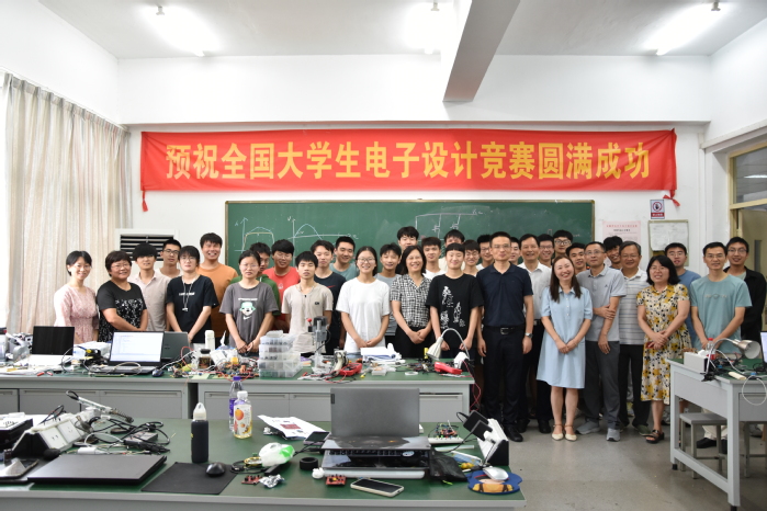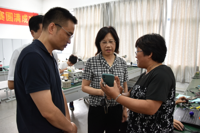 隨后,吳春梅來到創新實驗室,向正在緊張備賽的同學們表示問候,她詳細詢問同學們正在實驗的項目內容,了解大家在備賽中的困難和難點,叮囑同學們要努力備戰,勇于創新,把課堂理論所學應用于實踐創新,爭取以賽促學,提升個人專業水平和綜合素養。高先和介紹了從電子愛好者協會成長出來的優秀畢業生典型。吳春梅指出,電子愛好者協會提供了一個良好的平臺,學生們在創新技能競賽中能夠培養良好的創新意識,全方位鍛煉并提升實踐能力。吳春梅勉勵同學們認真準備,團結協作,發揮優勢,力爭突破,并與師生共同合影。