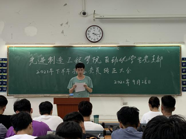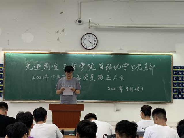 202192616:00,先進制造工程學院自動化學生黨支部36103教室召開了黨支部2021年下半年預備黨員轉正大會。自動化學生黨支部書記梅志強老師主持了本次大會,自動化學生黨支部全體黨員和9位群眾代表參加了大會。