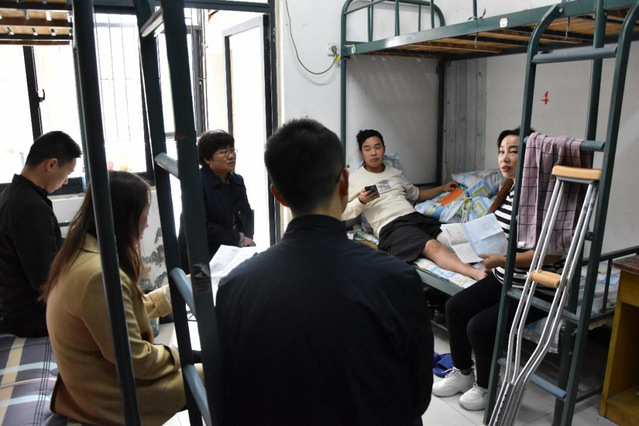龔蕭同學來自陜西省安康市,軍訓期間發生運動損傷被診斷為左膝髕骨脫位,并于10月8日在安徽醫科大學第一附屬醫院進行手術治療。交談中,杜娟書記詳細了解了龔蕭的術后恢復情況和近期對學業生活的安排,鼓勵龔蕭堅強樂觀面對病痛,戰勝困難,早日恢復健康,快樂投身學習生活。龔蕭同學表示在自己手術期間,學院和學校有關部門在國慶假期間給自己開通了醫保綠色通道,并為其家人安排了單人宿舍。在自己術后恢復期間,所有班委和舍友都在輪流幫助他打掃寢室衛生、扶持他去醫院進行復查,并且錄制老師上課的內容讓他進行網課學習,對此表示非常感謝。李秀娟副書記向龔蕭交代了學校的醫藥報銷程序,叮囑他在日后學習生活中遇到困難要及時和輔導員威力旺老師溝通。