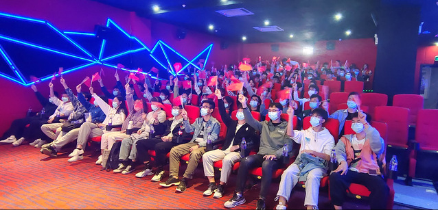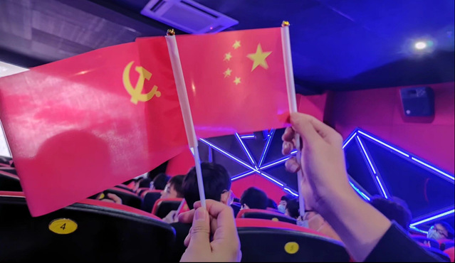 當影片接近尾聲,電影幕布上出現(xiàn)“偉大的抗美援朝精神歷久彌新!偉大的中國人民志愿軍烈士永垂不朽!”字幕時,全體觀影人員不禁鼓掌,手搖黨旗和國旗,抒發(fā)濃濃的愛黨愛國之情。