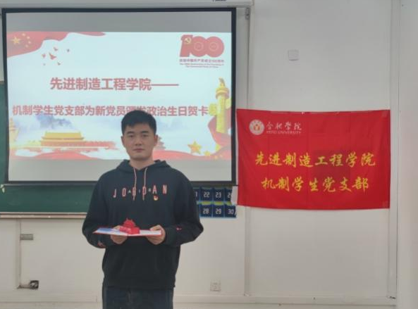 機制學生黨支部書記和支委會委員代表支部分別為6名正式黨員和25名新黨員送上了支部精心準備的帶有石庫門、天安門、紅船立體模型的3D“政治生日”賀卡,充分體現黨支部對黨員政治上的關心和精神上的鼓勵,同時也讓新黨員感受到黨支部的溫暖關懷。