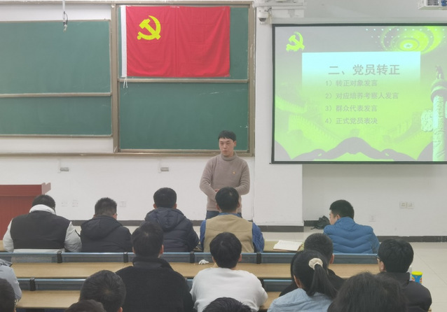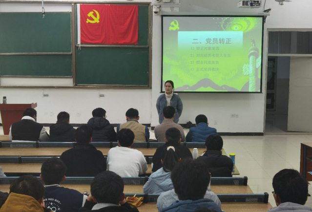 20211210日晚上,合肥學院先進制造工程學院機制學生黨支部于363階梯教室召開支部黨員轉正大會。支部6名正式黨員和35名預備黨員以及若干群眾代表參與了本次會議。本次會議由支部書記威力旺主持,會議宣布主題為討論決議預備黨員轉正問題,并通報了支委會研究意見:本次會議應參加有表決權的正式黨員7名,因病、因事請假1名,實到會黨員6名,超過黨員總數的80%,符合開會條件。