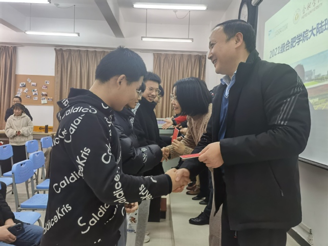 隨后,2021級新生代表朱林鋒同學作為大陸班新生代表發言,他表示自己很榮幸能夠加入大陸班,他從往屆學長的優秀榜樣身上汲取著前進的力量,從大陸公司對同學們成長的重視和指導中倍感溫暖,倍受激勵,希望大家經過團結拼搏,不斷努力,在畢業之季大陸班每個同學都能成為心目中優秀的自己。