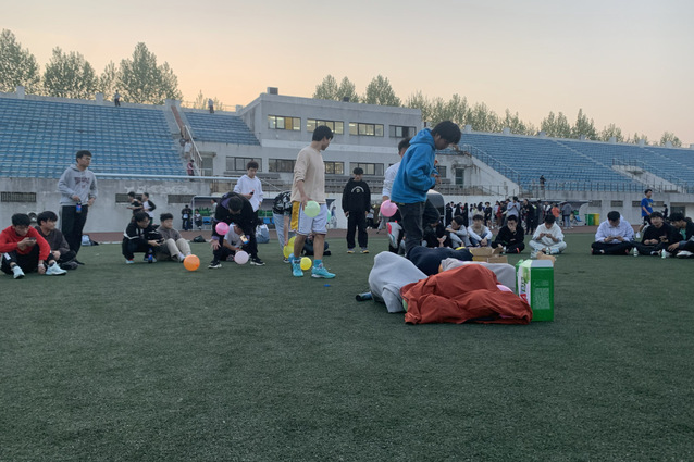 活動(dòng)伊始,本班學(xué)生在張傲老師的帶領(lǐng)下,進(jìn)行了“疫起跑一跑”這一活動(dòng)。井然有序的集體三公里跑步,有力的體現(xiàn)了學(xué)生的團(tuán)結(jié)一致。整齊劃一的號(hào)子,體現(xiàn)了同學(xué)們的抗疫決心和信息。“疫起唱一唱”直接把活動(dòng)氣氛推向了一個(gè)小高潮,學(xué)生圍坐一團(tuán)進(jìn)行著拉歌合唱。聽——“還記得你說家是唯一的城堡,隨著稻香河流繼續(xù)奔跑”周杰倫的“稻香”響徹了整個(gè)操場。在同學(xué)們的歡歌笑語中,活動(dòng)來到了壓軸好戲——“疫起玩一玩”。同學(xué)們以6-8人為一組,進(jìn)行游戲,踩氣球、劇本殺、狼人殺、誰是臥底等游戲如火如荼在操場上進(jìn)行著,很好的釋放了同學(xué)們封校期間的緊張心情。