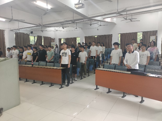 表決通過后,全體成員起立共同奏唱國際歌,雄壯的國際歌氣勢昂揚,表達了無產(chǎn)階級渴望解放自己,解放全人類的強烈愿望。我們每名黨員定會不忘初心、牢記使命,為實現(xiàn)共產(chǎn)主義偉大理想而奮斗終身!國際歌結(jié)束后,支部書記梅志強帶領(lǐng)新黨員入黨宣誓老黨員重溫入黨誓詞