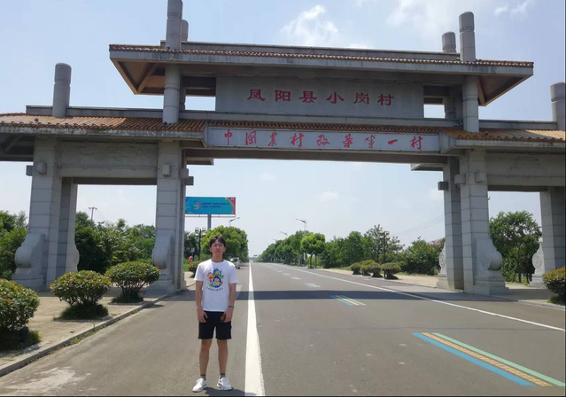 圖為調研人員在鳳陽縣小崗村牌樓前留影