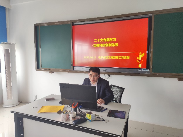 2023年4月11日下午2:00,先進制造工程學院電子信息工程系教工黨支部在38棟608召開支部大會,深入學習二十大報告。結合黨的二十大報告的學習,不斷“完善科技創新體系,促進科技成果轉化”。黨的二十大報告提出,必須堅持科技是第一生產力、人才是第一資源、創新是第一動力,完善科技創新體系。堅持創新在我國現代化建設全局中的核心地位。完善黨中央對科技工作統一領導的體制,健全新型舉國體制,強化國家戰略科技力量,優化配置創新資源,提升國家創新體系整體效能。不斷擴大國際科技交流合作,加強國際化科研環境建設,形成具有全球競爭力的開放創新生態。會議學習了安徽省聚焦科技創新的各項舉措和成果發展。2022年,安徽全力破除體制機制障礙,不斷深化科技體制改革、強化科技成果有效供給、科技成果對接交易平臺和科技金融支撐,安徽廣大科技人員面向經濟主戰場的熱情不斷高漲,推動了一大批科技成果就地交易、就地轉化、就地應用,把黨的二十大精神落實在推進科技成果轉化上,通過科技成果轉化推動安徽省高質量發展。