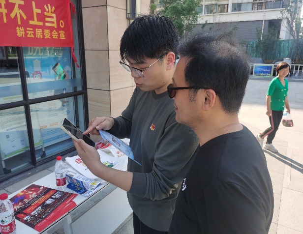 活動現場,機制學生黨支部的黨員們積極配合海恒社區耕云居委會工作人員,通過現場講解幫助居民下載國家反詐騙APP發放安全宣傳手冊印有活動內容的牌和購物編織袋等形式向現場居民和商戶普及商鋪用電安全、小區消防安全以及反詐騙相關知識。活動中支部成員耐心解答居民問題,通過群眾喜聞樂見的形式,讓群眾深入了解防災反詐工作的重要性,進一步增強了群眾防災反詐意識,切實提高群眾防災反詐能力。