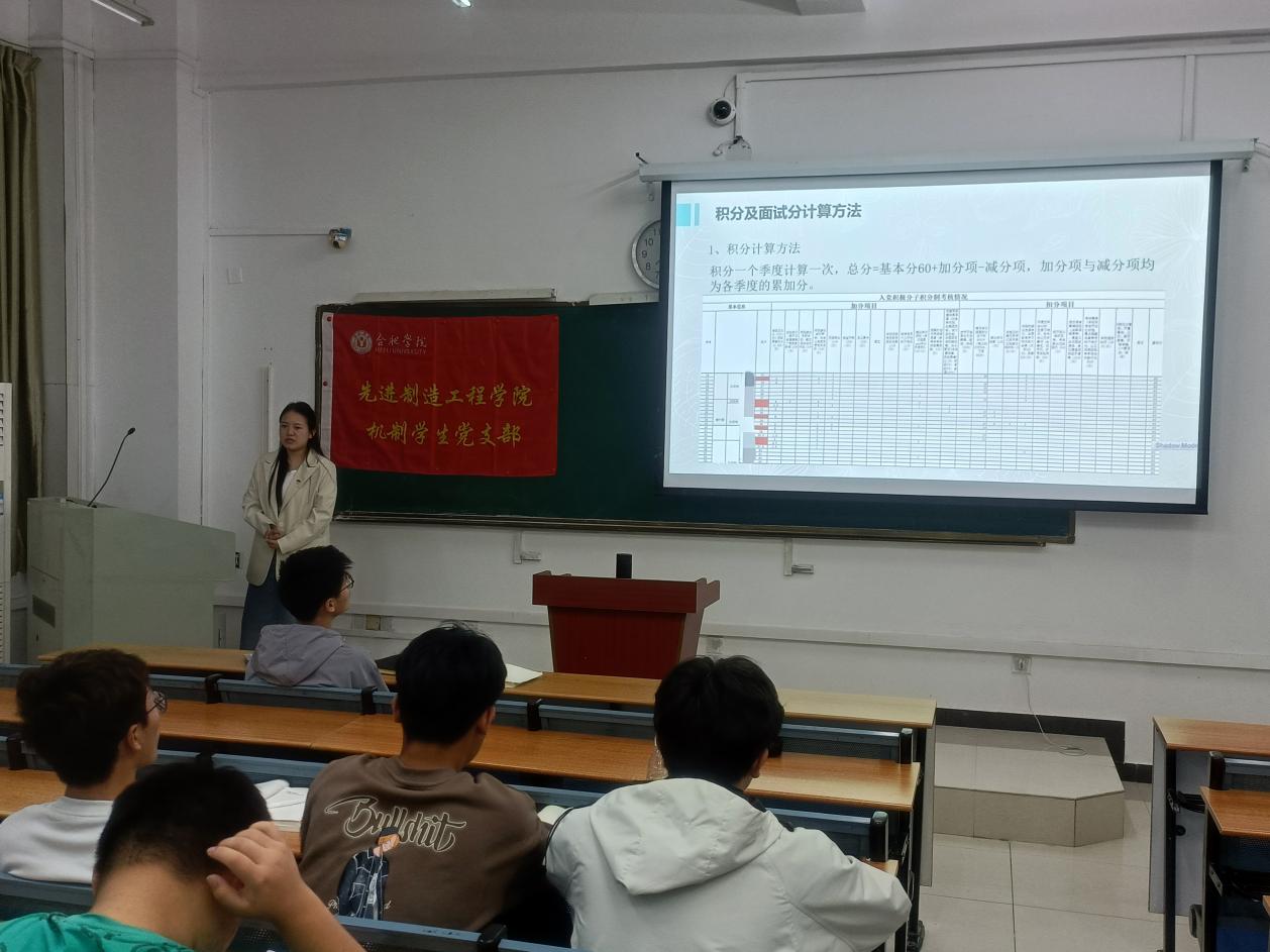 為使新生們更好地規(guī)劃自己的未來(lái)、度過美好的校園時(shí)光,進(jìn)一步樹立正確的社會(huì)觀、人生觀和價(jià)值觀,機(jī)制學(xué)生黨支部于20231025日晚上在36106教室開展“學(xué)長(zhǎng)來(lái)了——我的校園時(shí)光交流分享主題黨日活動(dòng)。本次活動(dòng)由機(jī)制學(xué)生黨支部書記威力旺老師主持,支部正式黨員周家喆、預(yù)備黨員程薇、發(fā)展對(duì)象溫司君及劉凡上臺(tái)分享了自己關(guān)于思想、學(xué)習(xí)、生活、工作等方面的心得,2023級(jí)機(jī)制專業(yè)全體新生參加了本次活動(dòng)。