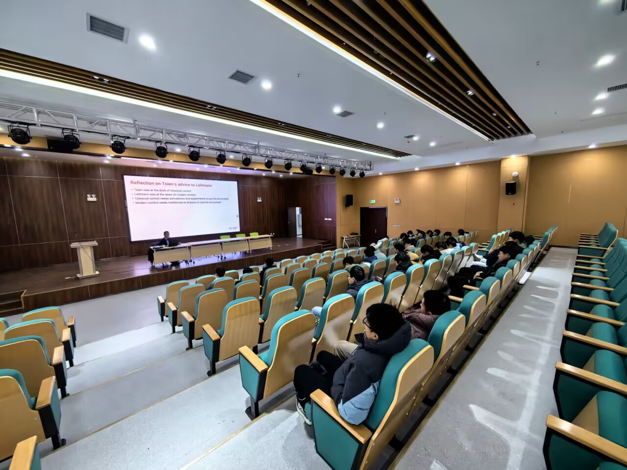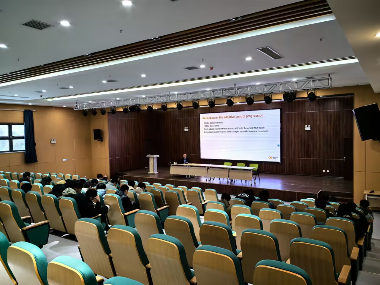 2023年12月18日(周一)上午九點(diǎn)半,在合肥大學(xué)南艷湖校區(qū)55棟205報(bào)告廳,23電子信息碩士生部分成員參加了由合肥大學(xué)科研處、先進(jìn)制造工程學(xué)院主辦,美國(guó)加州大學(xué)Ye-Hwa Chen博士主講的題為“The Character of Control Theory ”的學(xué)術(shù)報(bào)告。Ye-Hwa Chen 博士詳細(xì)介紹了控制論的歷史,從工業(yè)革命時(shí)期詹姆斯·瓦特創(chuàng)造性地提出了一種反饋轉(zhuǎn)矩來(lái)平衡蒸汽機(jī)的旋轉(zhuǎn)變化。到演變?yōu)楣诺淇刂疲俸髞?lái)發(fā)展為現(xiàn)代控制和后現(xiàn)代控制。講述了目前有許多成熟的控制方法是由創(chuàng)造性的工程師開(kāi)發(fā)的,它們從最優(yōu)性、適應(yīng)性、魯棒性和智能化等方面解決了工業(yè)中的實(shí)際問(wèn)題。最后帶同學(xué)們回顧發(fā)展過(guò)程,解答了一個(gè)自然的問(wèn)題:這些控制論背后的共同特征是什么?