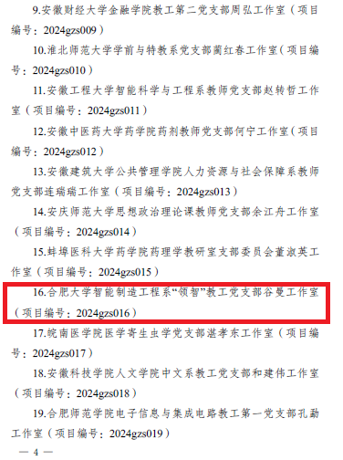 近日,中共安徽省委教育工委印發《中共安徽省委教育工委關于公布第二批全省高校“雙帶頭人”教師黨支部書記工作室立項建設名單的通知》(皖教工委函〔2024〕79號),合肥大學先進制造工程學院智能制造工程系“領智”教工黨支部谷曼工作室成功獲評全省第二批高校“雙帶頭人”教師支部書記工作室。學院基層黨建工作再創新佳績。