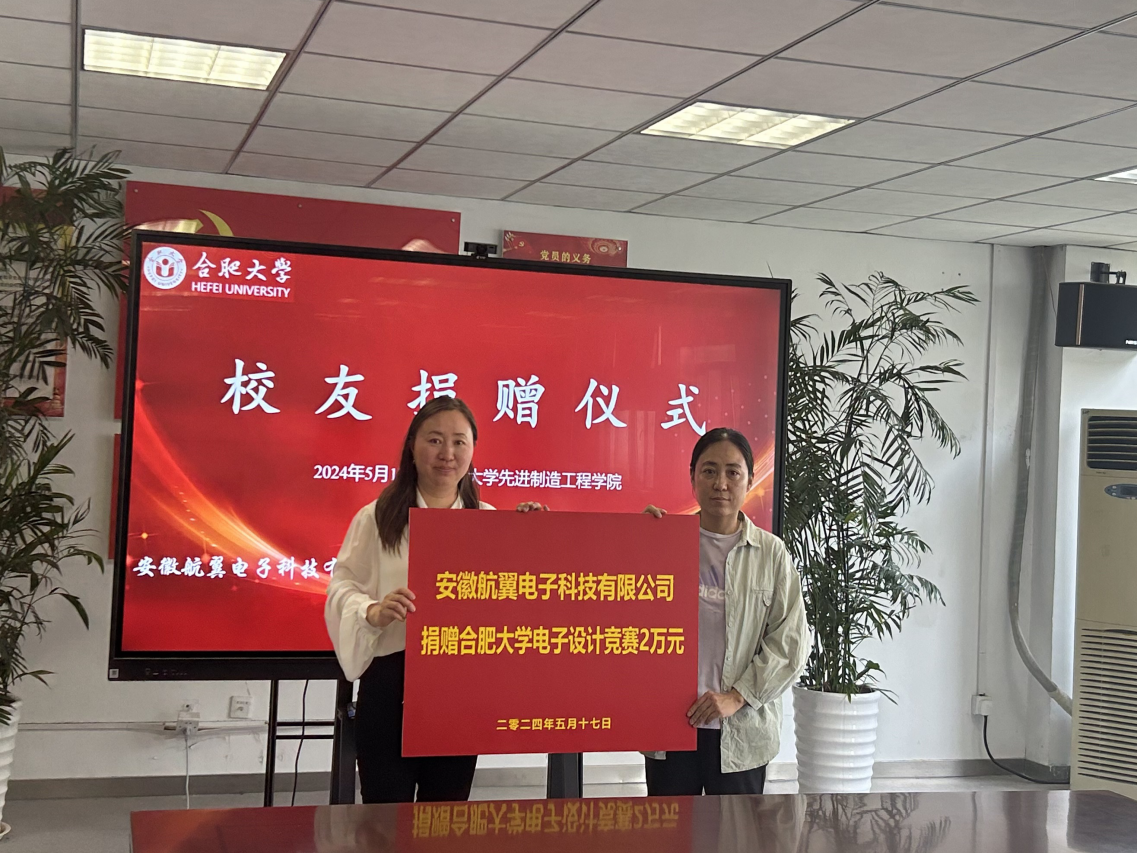合肥大學校友、安徽航翼電子科技有限公司總經理張永麗、副總經理張翼,校教務處副處長王仁寶、校雙創中心副處長孫虹、合肥大學先進制造工程學院黨委書記杜娟、院長胡學友、副書記蔡靈美、副院長胡國華、電子設計競賽負責人李翠花等參加捐贈儀式。
