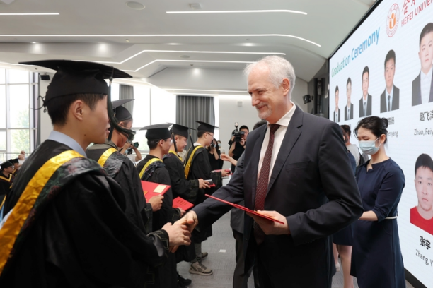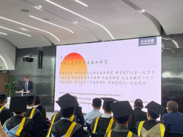 The morning of June 16, 2022 sees the graduation ceremony at Volkswagen Anhui of the first batch of “Seed Engineers” jointly trained by HFU and Volkswagen Group China. Wu Chunmei, HFU President, attends the ceremony together with Mr. Jens Pfitzinger, Volkswagen Group Executive Vice-president and Dr. Gabardi, CEO of Volkswagen Anhui.