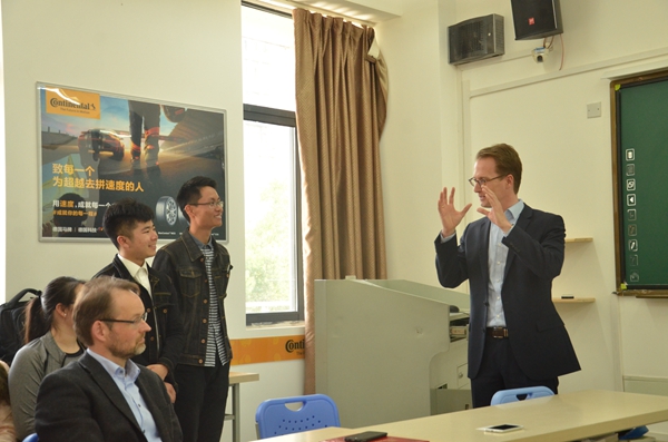 大陸公司一行人蒞臨大陸班學生教室與學生進行了交流。學生們從學習方式、能力的提升和課余活動經歷等方面介紹了大陸班帶給他們的全方面能力的提高,并為大陸班未來的發展提出了建議。Sven Carsten Lange在發言中說道,期待大陸班能夠取得更好成績。大陸班是以培養應用型人才為目標,有明確的目標在學生學習中是極為重要的。他向同學們介紹了去德國留學的要求,并鼓勵他們保持熱情,努力展示自己的才能。