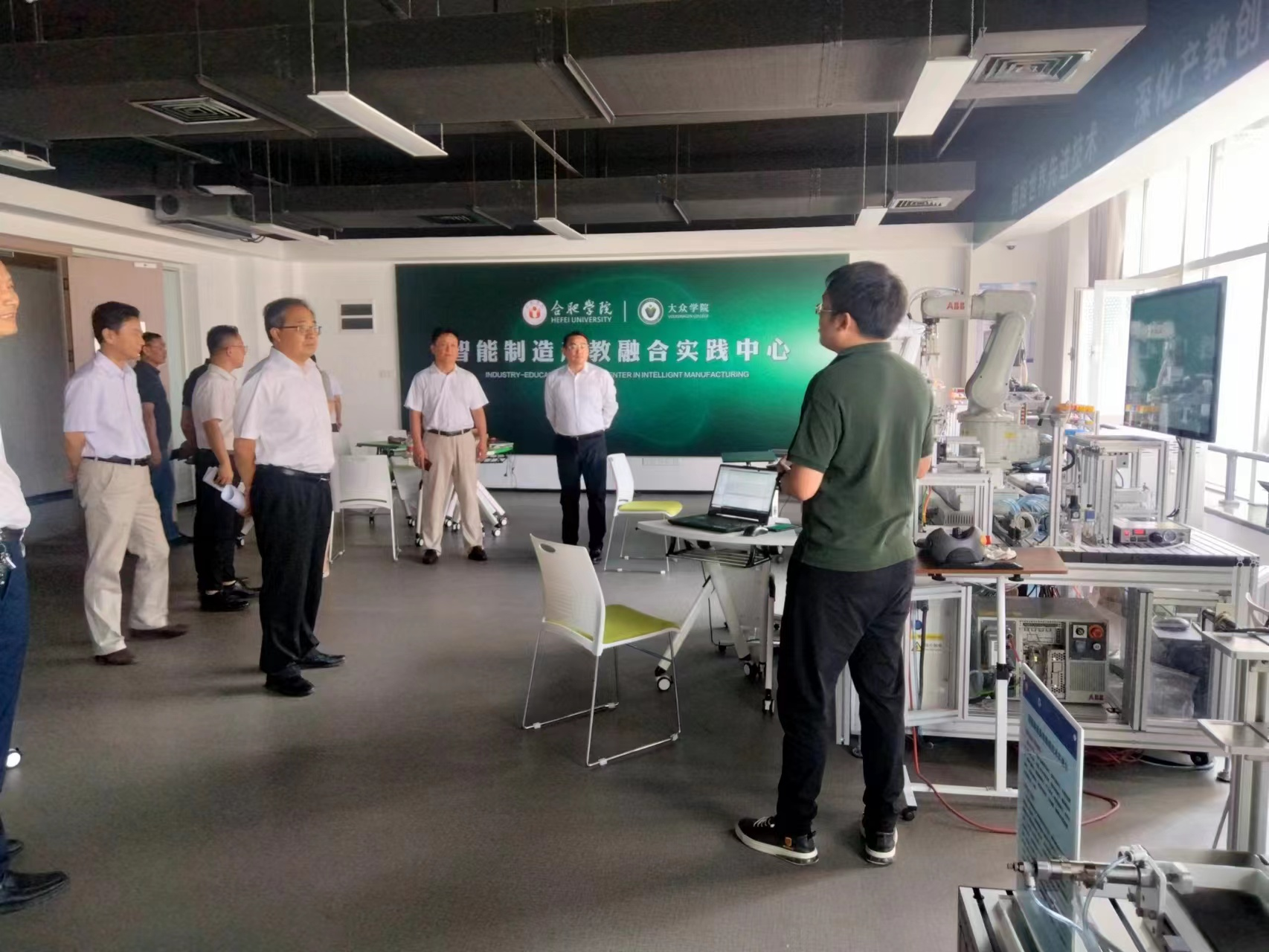 2023年8月31日上午,安徽省專項整治實地督查組(第四組)由省住房城鄉(xiāng)建設廳二級巡視員汪恭文帶隊,赴我校開展實地調(diào)研,合肥市政府副秘書長鐘德應、市民政局三級調(diào)研員郜志華、市民政局四級調(diào)研員潘獻金,合肥學院發(fā)展規(guī)劃處宋海峰處長等陪同。 汪恭文一行參觀了53號樓安徽省現(xiàn)代電子控制與檢測應用技術協(xié)同創(chuàng)新中心、7號樓大眾學院智能制造產(chǎn)教融合實踐中心,聽取實驗室負責人關于項目情況、實驗設備、應用型人才培養(yǎng)等情況的匯報,深入了解學校教學、科研及產(chǎn)教融合項目建設情況。