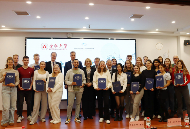 隨后,雙方來到設計學院參加德國學生徽文化秋令營結業儀式。儀式在活動回顧短片中開場,短片展示了德國學生在合肥大學交流期間豐富多彩的學習生活,德國學生深度體驗舞龍舞獅、中國功夫、針灸推拿、書法、飲茶等多種不同的中華傳統文化,深刻體現了中華文化的魅力。王其東書記代表學校對卡塔琳娜·普特市長一行表示熱烈的歡迎,對徽文化秋令營的成功舉辦表示祝賀,他表示德國同學在短短一周內同中國學生建立起深厚情誼,為日后攜手書寫兩校友誼新篇章打下堅實基礎,此次交流為雙方未來教育、經濟、文化發展注入了生機與活力。奧斯納布呂克應用科學科學大學校長亞歷山大·施梅曼先生在致辭中感嘆中國發展速度之快,同時也很高興看到合肥大學的高速發展變化,希望有更多形式的交流活動能夠加深兩校友誼,深化合作與發展。德國奧斯納布呂克應用科學科學大學的學生代表伊爾薩比·拉德馬赫發言,她向大家分享了她在合肥大學交流期間新奇的體驗與感悟,并表示會記住這段美好回憶。