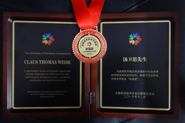 2018年12月10日合肥經濟技術開發區管理委員會授予了湯衛思教授第二屆合肥經濟技術開發區友誼獎該獎項授予八位國際專家,以表彰他們對HEDTA(合肥學院的合肥經濟技術開發區社會經濟發展的支持和友好合作。獎項表明我們團隊的工作得到了地方政府的認可。此獎項還顯示了HEDTA(合肥學院的合肥經濟技術開發區的國際性和日益重要的意義,來自六個不同國家和三個部門(工業、研究和教育)的受援者受到了表彰。