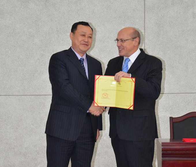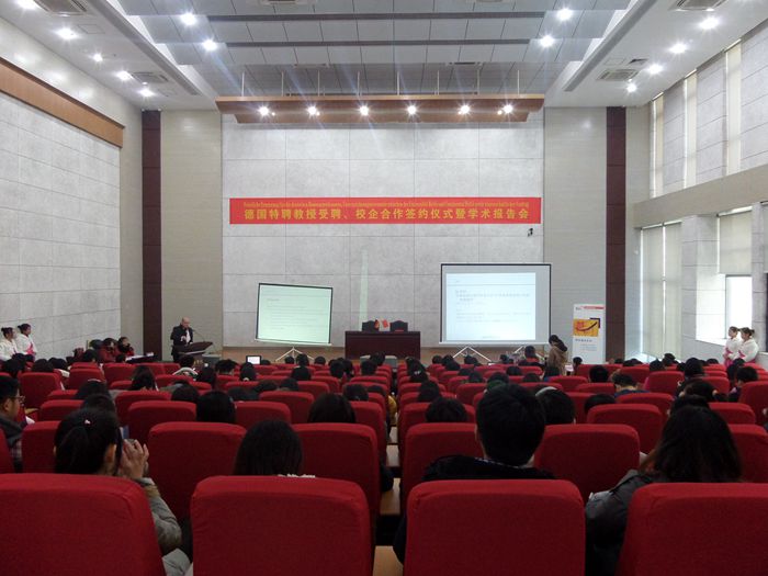 書記蔡敬民為庫爾特?博德維克先生頒發聘書 書記蔡敬民為麥克?伊格納先生頒發聘書 雙方簽訂校企合作協議 庫爾特?博德維克先生報告會現場